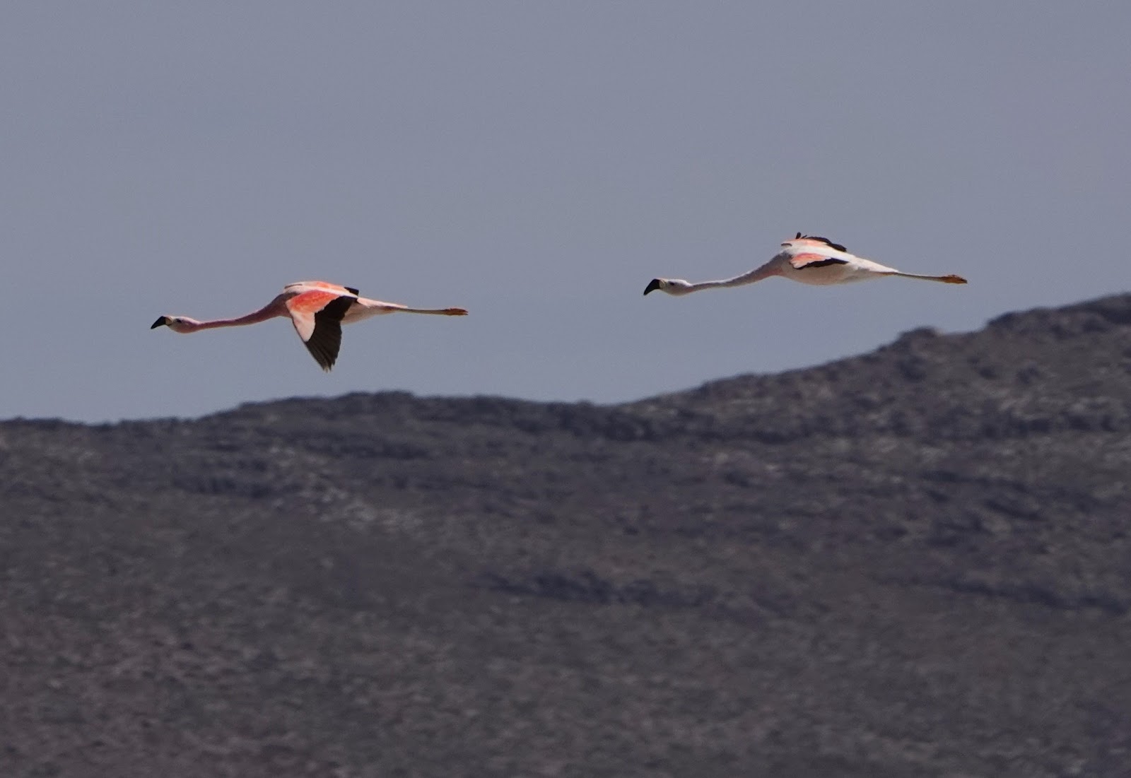 When we got a bit closer, Juan focused his scope on the flamingos. It looked like they were all Chilean Flamingos, but wait, one had a darker bill, is that an Andean Flamingo? It was! Later Juan picked out just one, smaller James Flamingo among the bunch! Yes, the trifecta!
